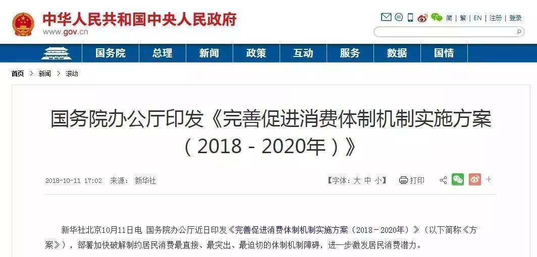 10月11日,国务院办公厅印发《完善促进消费体制机制实施方案(2018-2020年)》, 提出2018-2020年要大力发展住房租赁市场, 推动传统商贸创新发展,建设培育特色商贸小镇。
