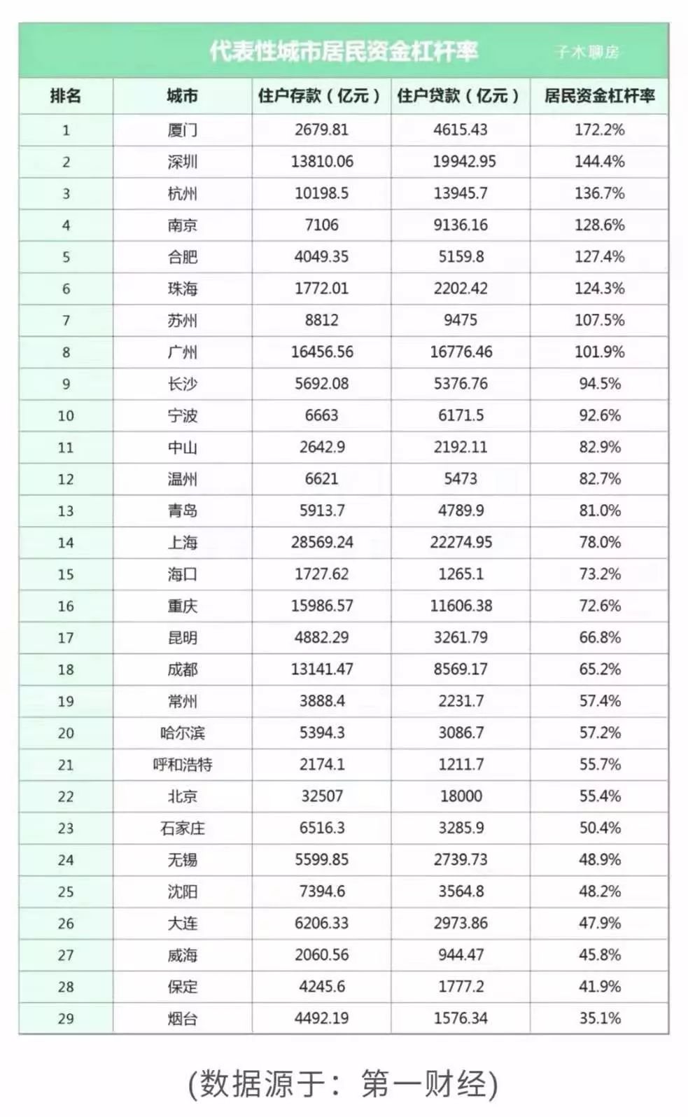 杠杆率最高的城市以此为:厦门、深圳、杭州、南京、合肥、珠海、苏州、广州、长沙、宁波……