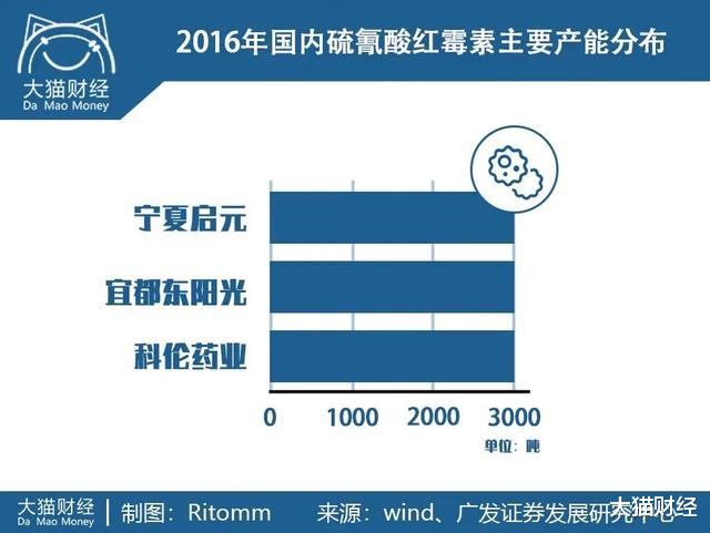 猫哥来举个例子吧,有一种原料药叫硫氰酸红霉素,用来制作各种阿奇霉素、红霉素、琥乙红霉素、罗红霉素等等抗生素。这个原料药的全球需求量总共9000吨,湖北的科伦药业每年就生产3000吨,占了全球的三分之一,关键另外两家厂商,宁夏启元和四川东阳光,也各有3000吨,这三家公司,就把这个抗生素原料药的全球需求解决了。