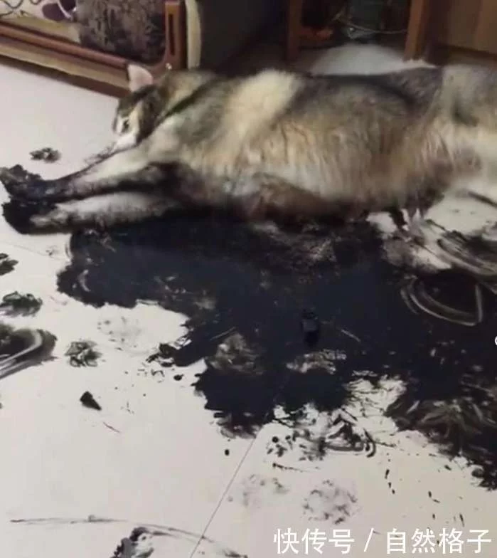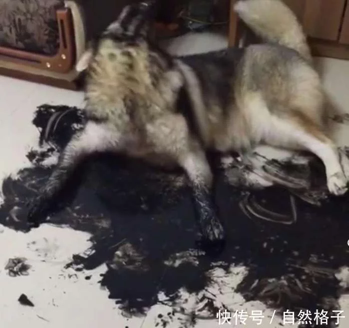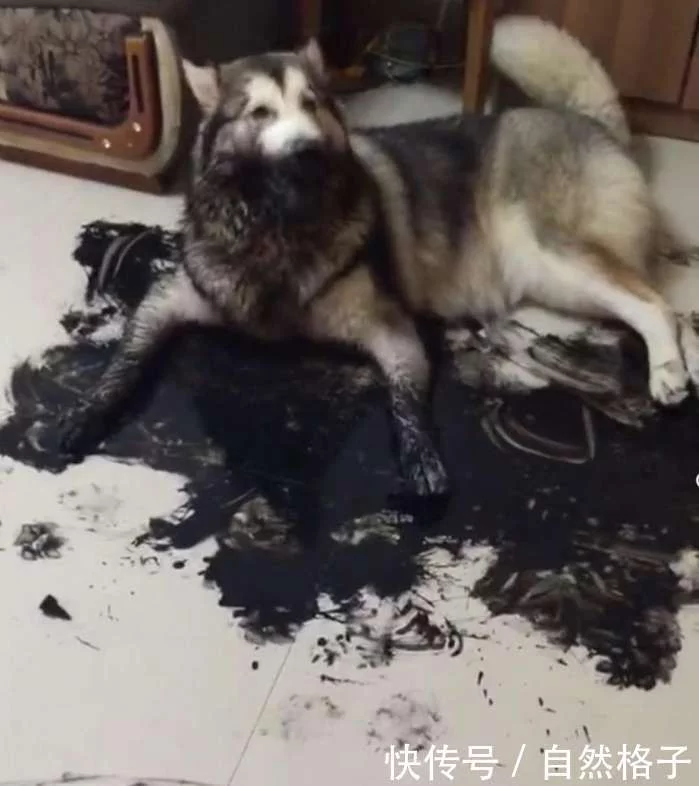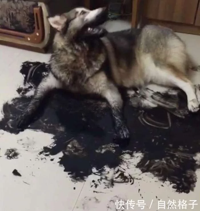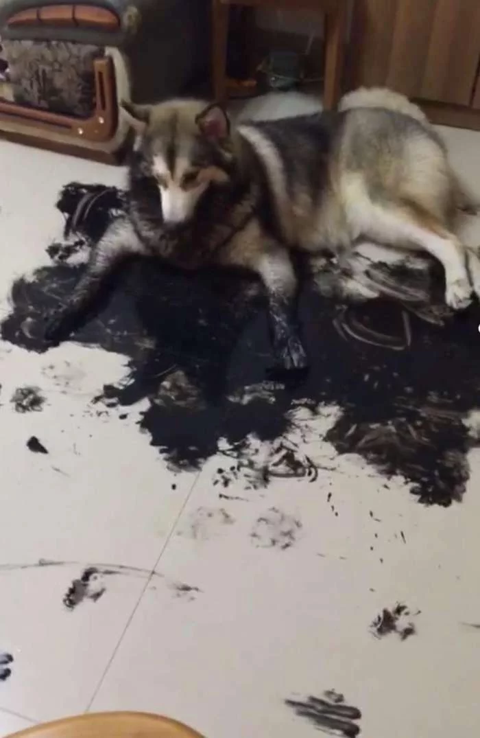 一天,主人外出办事,于是把哈士奇关在家里。哈士奇在家闲得无聊,想起平时见主人写字画画似乎很有趣,心里发痒,于是打翻墨水瓶,开始“舞文弄墨”。主人回来后,看到一身黑黢黢的哈士奇和满地板的狗爪印,哭笑不得。