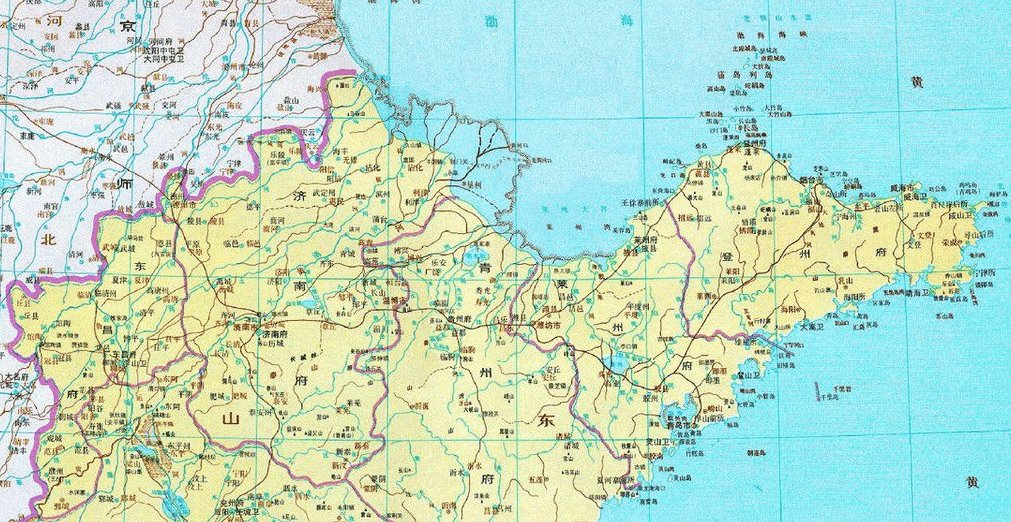 明始置山东行省,辖济南府,青州府,兖州府,东昌府,登州府,莱州府,辽东都司。清朝将辽东半岛划入盛京,由盛京将军统辖 。山东青岛,威海先后造列强侵占。