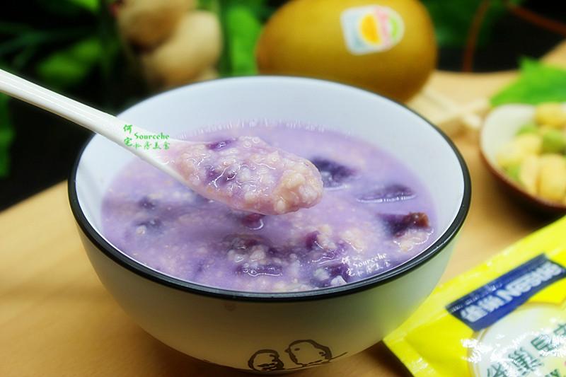 【麦片紫薯粥】食材:紫薯、燕麦片、白砂糖。紫薯挑选新的,光滑没有黑点,有黑斑的紫薯不能吃。另外紫薯比红薯口感好,营养丰富。把紫薯洗净,切片,切小方块,太大块煮的时候时间要长些。