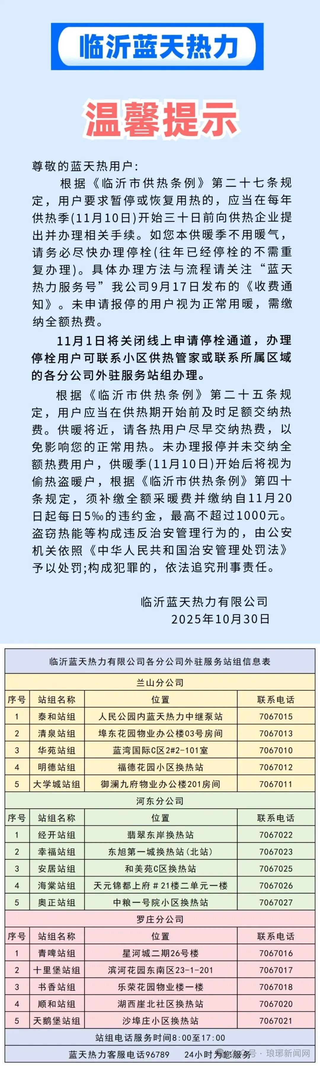 供暖将近临沂蓝天热力发布温馨提示提醒热用户尽早交纳热费以免影响正常用热11月1日蓝天热力将关闭线上申请停栓通道未办理报停并未交纳全额热费用户供暖季(11月10日)开始后将视为偷热盗暖户