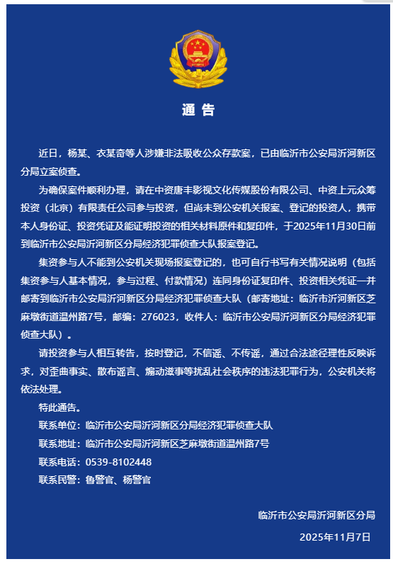 11月7日临沂市公安局沂河新区分局发布通告杨某、衣某奇等人涉嫌非法吸收公众存款案已被立案侦查请相关投资人于2025年11月30日前报案登记
