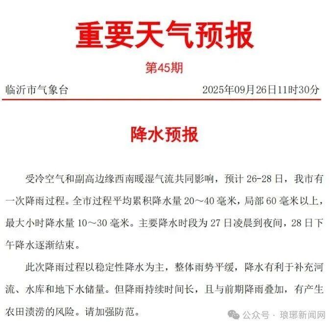 刚刚,临沂市气象台发布重要天气预报图片临沂最新天气预报今天下午到夜间多云转阴有小到中雨局部大雨东北风3~4级气温24~17℃27日白天到夜间阴有中到大雨东北风转偏西风3~4级气温22~18℃