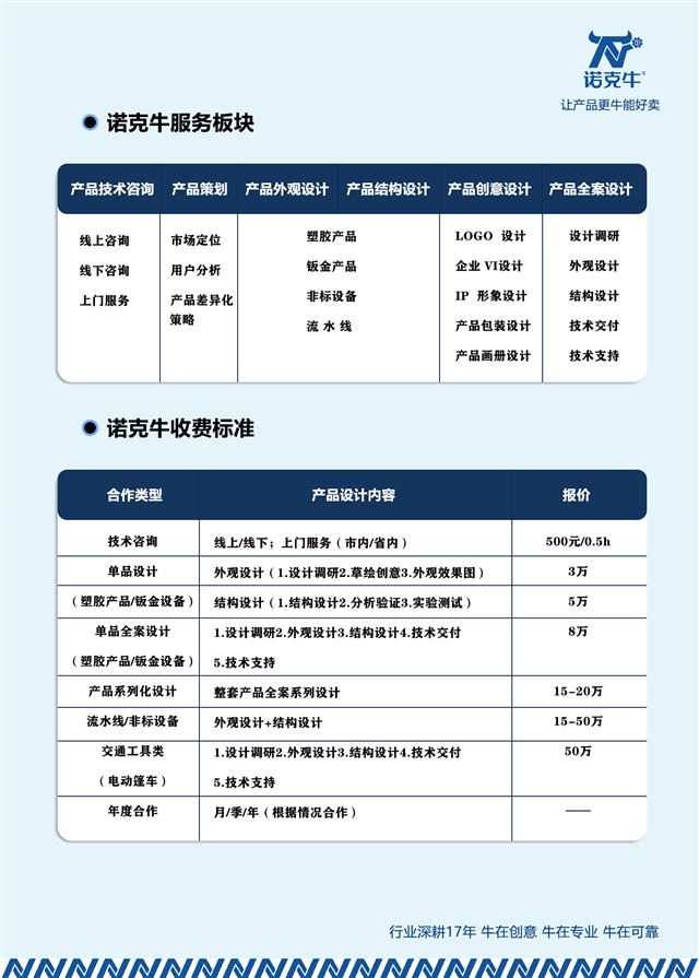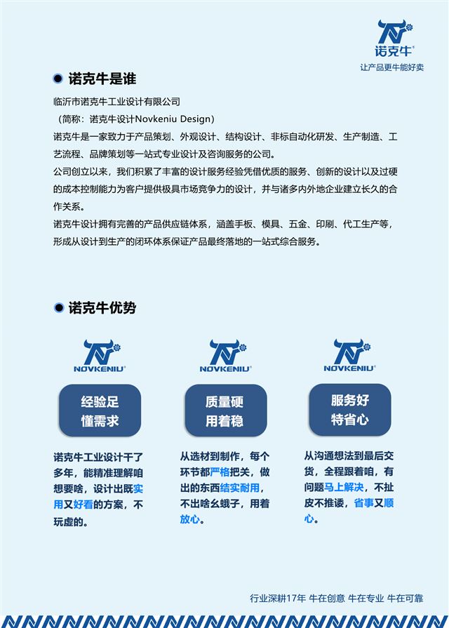 山东诺克牛工业设计有限公司novkeniu.com(简称:诺克牛设计Novkeniu Design)成立于2018年3月,是一家致力于产品策划调研、外观设计、结构设计、非标自动化研发、生产制造、工艺流程、品牌策划等一站式专业工业设计及咨询服务的公司。