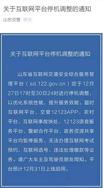 从山东省公安厅交通管理局获悉,山东省互联网交通安全综合服务管理平台(sd.122.gov.cn)定于12月27日(周五)17时至30日(周一)24时停机维护。届时互联网平台、交管12123APP、农村平台、互联网事故快处、12123语音服务平台、警邮合作平台、政务资源共享平台均暂停服务,无法办理互联网考试预约、互联网选号、违法处理缴款等业务、互联网补换驾驶证、互联网补换行驶证等业务,24小时无人警局自助设备无法使用。系统升级期间,车管部门窗口办理业务费用只收现金。平台预计12月31日上线启用。