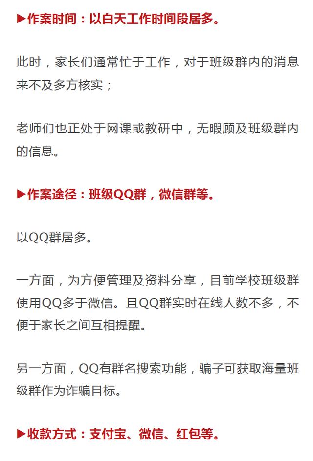 可是,付款后发现弹出的收款方为“某个体户”!张先生立即电话联系班主任,才知道被骗了。龙岗警方介绍,4月15日以来,像张先生一样被骗的家长已有65位,损失金额67.7万元。警方起底:骗子作案四步走本不是什么新奇的作案手法,却在返校复课前集中爆发。对此,警方起底骗子的作案手法,主要分四步: