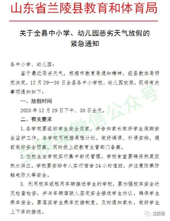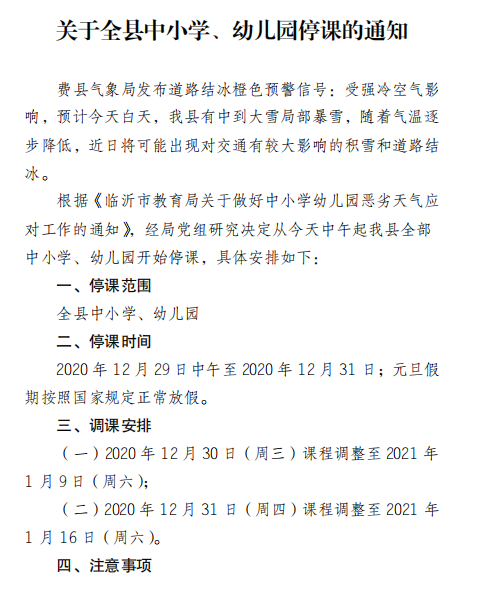 鉴于当前风雪较大、路面湿滑、气温较低的天气状况,根据《临沂市教育局关于做好中小学幼儿园恶劣天气应对工作的通知》要求,为尽量避免道路结冰给学生上下学带来不便,各学校、幼儿园可于12月29日下午两节课后,根据各自实际情况,安排好走读学生错时放学,小学一律不再安排课后服务;30日停课1天(如有变动,另行通知)。停课期间,学校可适当布置家庭作业。