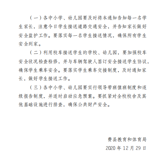 1、请各学校通过短信、微信等多种方式,及时通知每一名走读生学生家长,及时接送学生并注意上下学安全,提醒家长做好安全监护工作。学校要落实每一名学生接送情况,确保所有学生安全到家。学校要适当布置家庭作业。