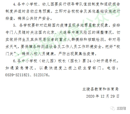 根据《临沂市教育局关于做好中小学幼儿园恶劣天气应对工作的通知》要求,结合我区实际,经局党组研究决定,各学校幼儿园走读生从12月29日下午两节课后错时放学,30日停课一天(如有变动,另行通知)。具体安排如下: