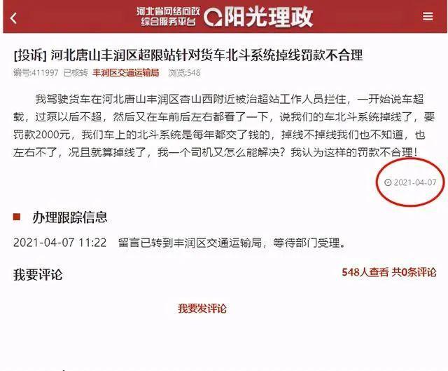 据河北省网络问政平台“阳光理政”的投诉信,这货车司机表述,自己驾驶货车在河北唐山丰润区杏山西附近被治超站工作人员拦住,“一开始说车超载,过泵以后不超,然后又在车前后左右都看了一下,说我们的车北斗系统掉线了,要罚款2000元”。