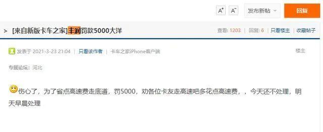 3月23日,有网友在卡车之家发帖称,为了省点高速费走了底道,罚款5000块。