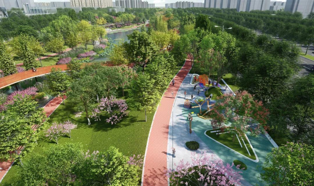 该绿带公园主要包括如意湖公园、邻里花园、中央绿谷公园、体育公园、凤栖湖公园5个重要的公园。如意湖公园是社区服务、商业休闲与景观相融合的公园;邻里花园主要为周边居民提供了日常休闲、漫步的场所;中央绿谷公园是我们的高架景观桥与观赏草的打卡地;体育公园为周边居民增加了一个全龄化的社区运动公园;凤栖湖公园未来将成为河东区对外形象展示的景观客厅,也将成为河东区的新地标。