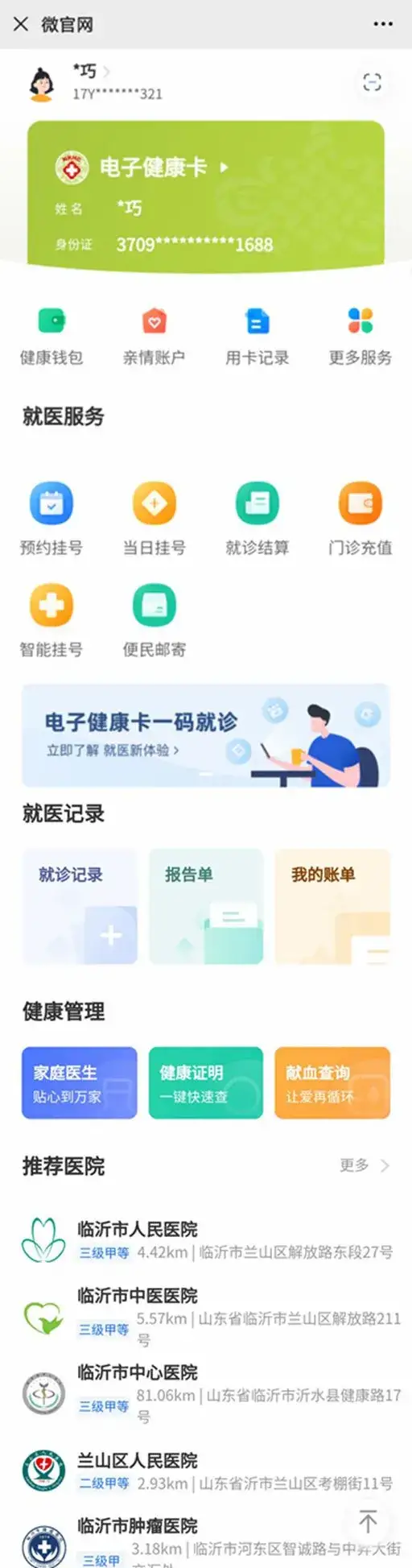 “健康临沂”微信公众号-“预约挂号”-“电子健康卡”