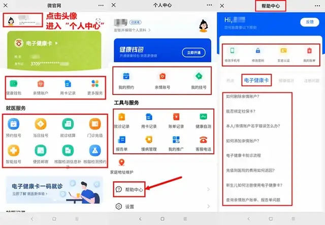 进入电子健康卡-点击头像进入个人中心-帮助中心-电子健康卡问题答疑