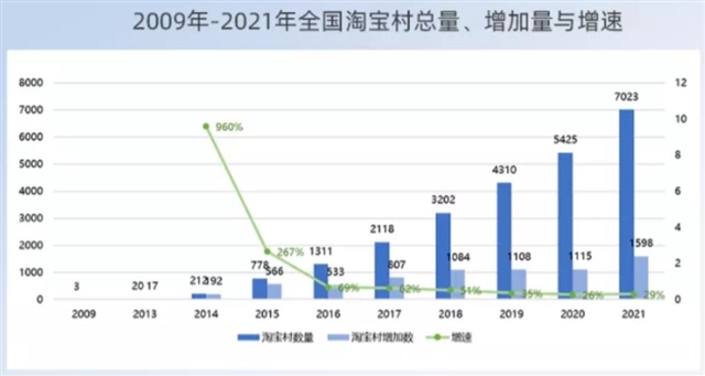 日前,南京大学空间规划研究中心、阿里研究院最新研究结果显示,2021年淘宝村数量突破7000大关达到7023个,较上年增加1598个,连续第四年增量保持在1000个以上。