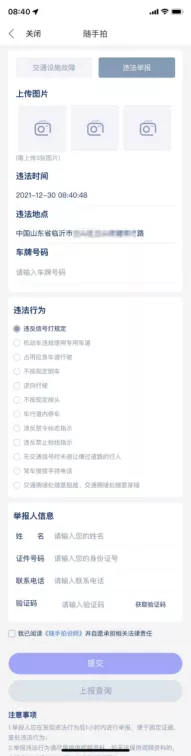 违法举报功能主要分为上传图片、违法相关信息和车牌号码、举报人信息等模块。按照要求提交如下资料: