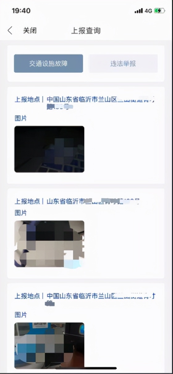 故障查询页显示的是历史上报信息,每条显示上报地点和上报时的图片(点击可放大显示)。