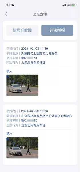 违法举报查询页同样显示的是历史举报信息,每条显示举报地点、时间、举报车辆和违法行为,同样包括举报时上传的图片(点击可放大显示)。