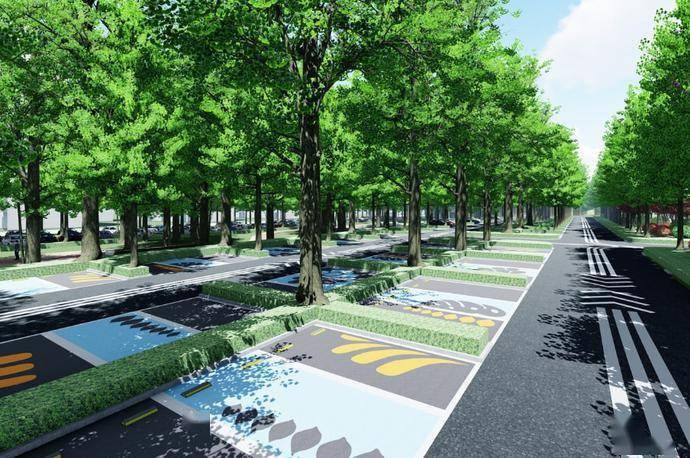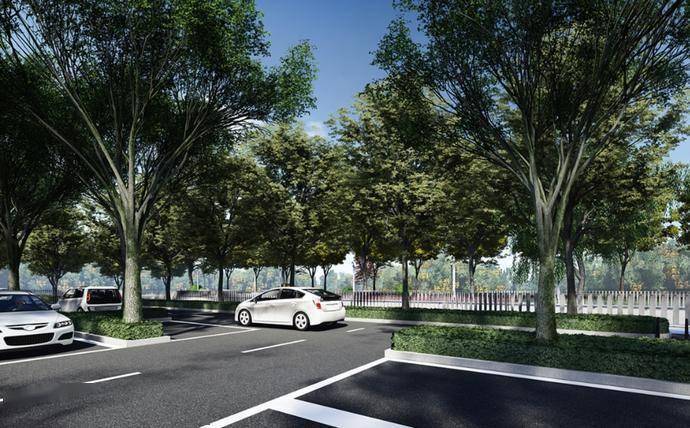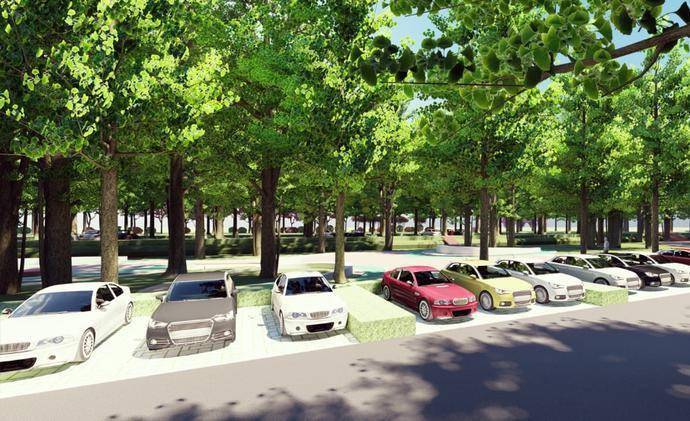 方案以银杏为骨干树种,建造247个车位的生态停车场,将停车空间与园林绿化空间有机结合,兼顾停车与生态绿化双重功能。同时,结合周边环境,合理设置休憩设施、公厕等服务项目。
