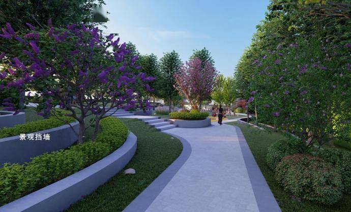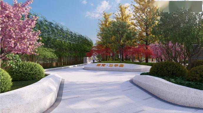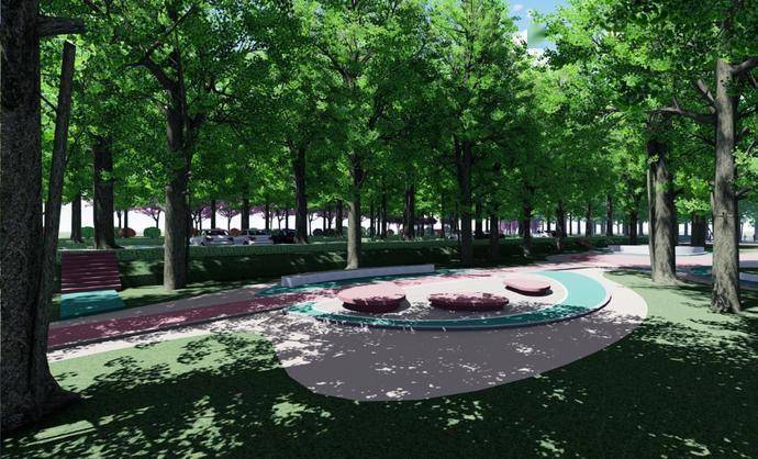 公园定位为休闲、邻里交流为主题的艺术阅读公园。结合现状树阵,设置艺术桌凳、条石座椅等景观小品打造林下阅读空间。同时,在现状植被的基础上增加紫薇、樱花等观花树种。