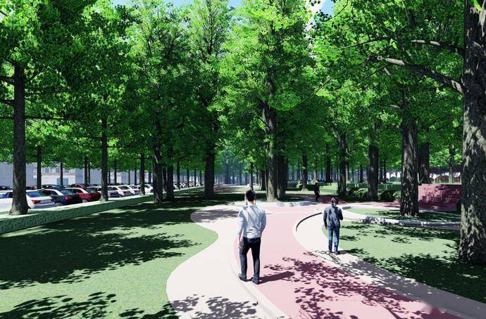 方案采用“疏林草地”的设计手法,将榉树、水杉、草坪等进行科学搭配,场地设游园步道、休憩设施、活动设施、公厕、林荫停车场等,在提供市民就近活动场所的基础上缓解部分交通拥堵。