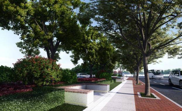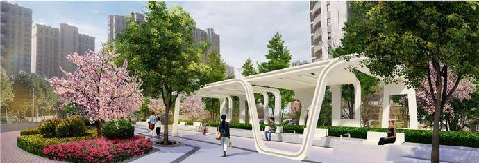 公园位于道路平交口,结合周边商铺,定位为现代艺术商业绿地和现代休闲绿地。设置廊架、布置休闲座椅,增加早樱、夏鹃等开花植物,提升城市色彩。