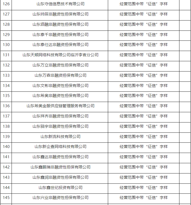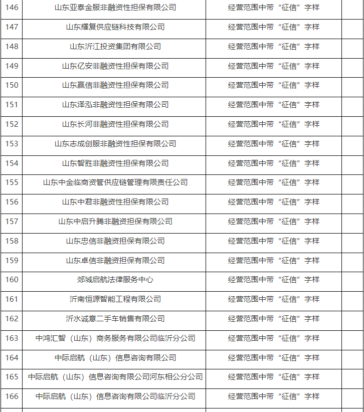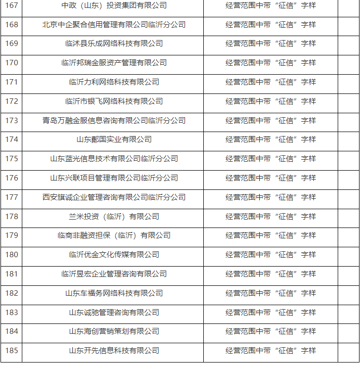 为维护信息主体和社会公众合法权益,净化征信市场,优化营商环境,自3月起,中国人民银行临沂市中心支行、临沂市发展和改革委员会在全市组织开展“征信修复”乱象和规范“征信”字样使用专项治理工作。经排查,截至2022年4月27日,我市共有185家机构在其注册名称或经营范围中违规使用“征信”字样。现将上述185家机构列入《违规使用“征信”字样限期整改机构名单》(见附件),予以公告。请相关企业于2022年5月20日前到当地行政审批服务局办理营业执照名称和经营范围变更手续,对逾期未整改的将依法依规处理。