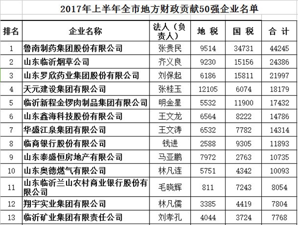 2017上半年临沂全市地方财政贡献50强企业出炉,看看都有谁