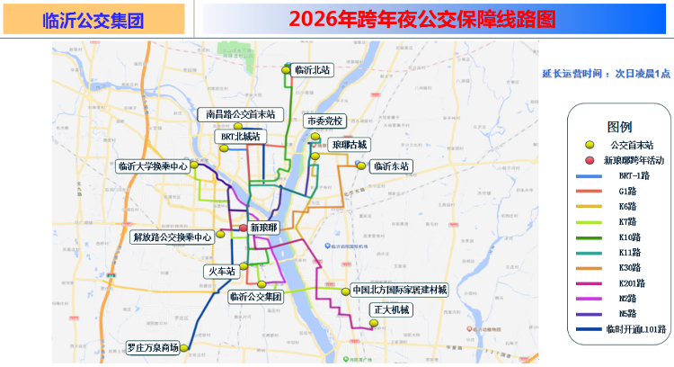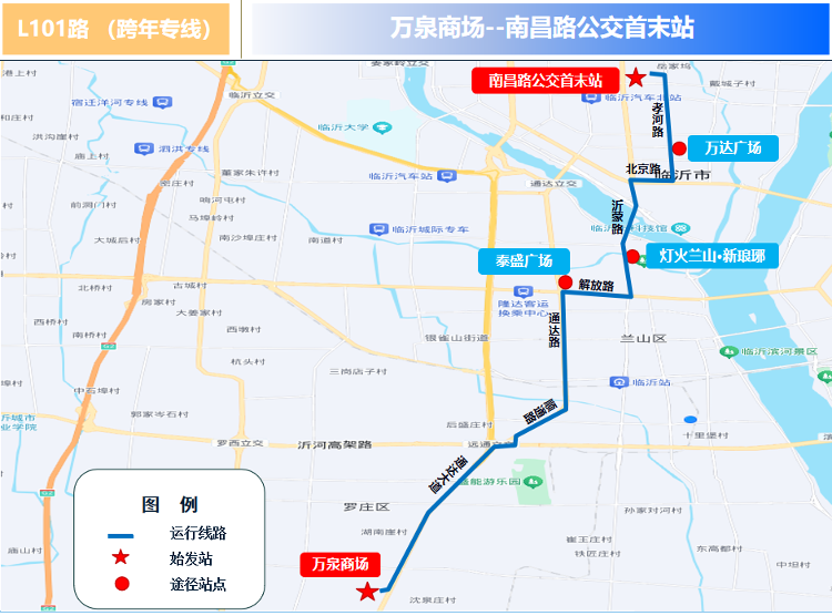 12月31日,临沂公交1条跨年专线即将开通,10条公交线路运营时间延长至凌晨1点。 开通L101路(跨年专线) 线路途经:L101路由罗庄区万泉商场发往南昌路公交首末站,途经通达南路、解放路、