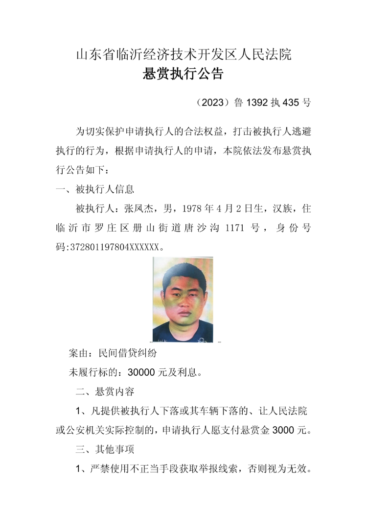 为充分利用社会力量查找被执行人财产及线索,有效执行生效法律文书,现根据申请执行人的悬赏执行申请,依照《中华人民共和国民事诉讼法》《最高人民法院关于依法制裁规避执行行为的若干意见》的相关规定,临沂经