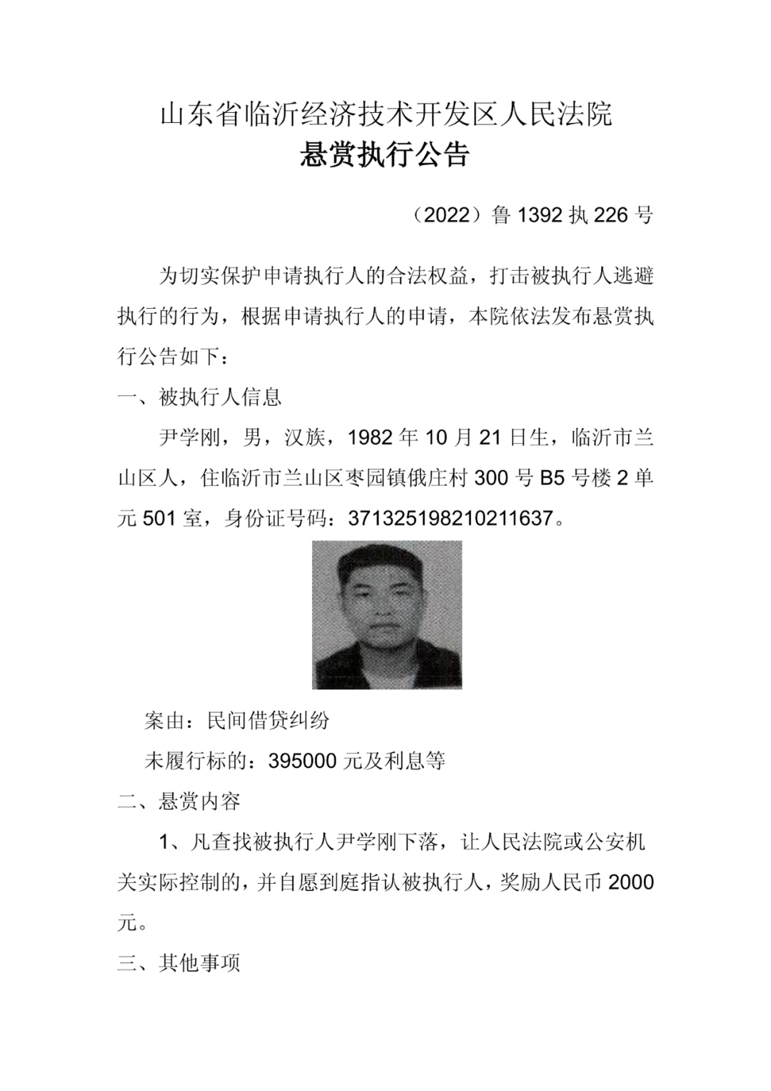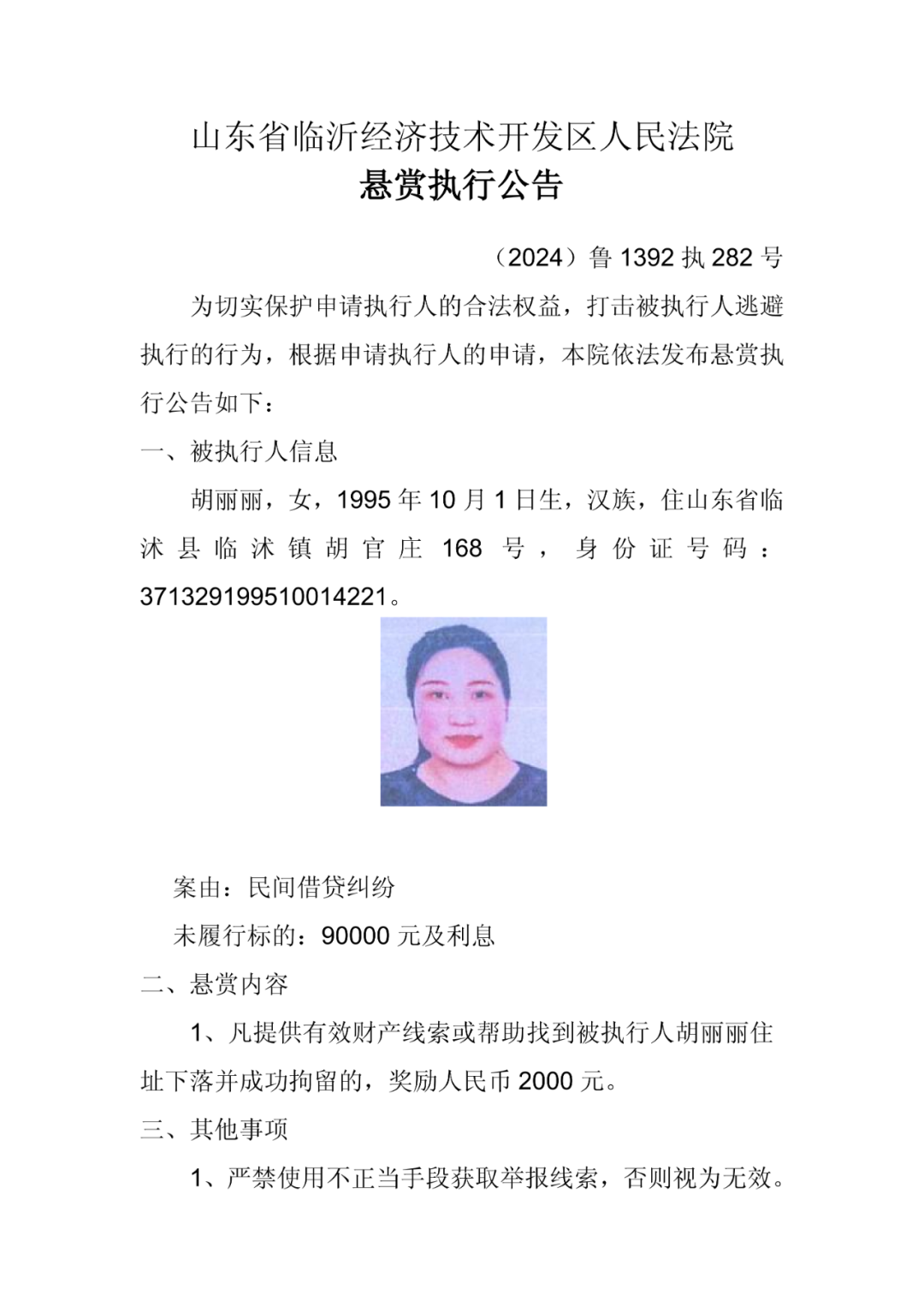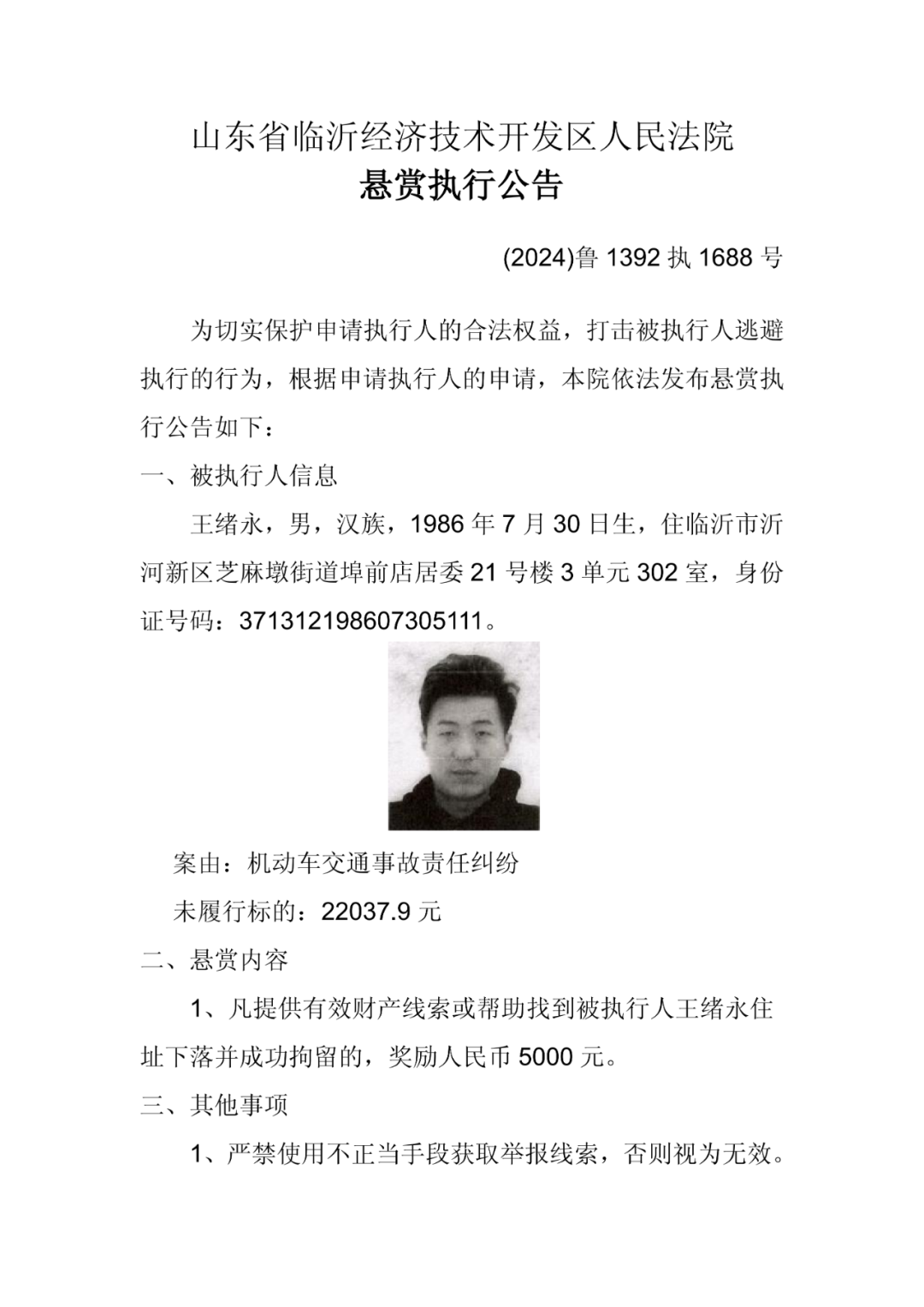 为充分利用社会力量查找被执行人财产及线索,有效执行生效法律文书,现根据申请执行人的悬赏执行申请,依照《中华人民共和国民事诉讼法》《最高人民法院关于依法制裁规避执行行为的若干意见》的相关规定,临沂经济技