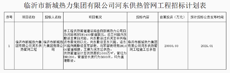 近日,临沂市新城热力集团有限公司公布了河东供热管网工程的招标计划,包含供热管网工程和中继泵站项目两个重要部分,预计招标公告将于2026年1月发布。 据悉,供热管网工程将自新城热力公司白马河路现状