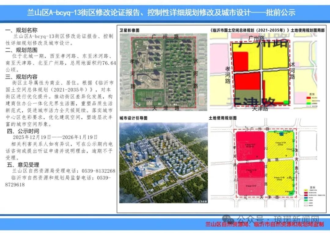 近日兰山区自然资源局发布兰山区A-bcyq-13街区修改论证报告、控制性详细规划修改及城市设计批前公示详情如下一、规划名称兰山区A-bcyq-13街区修改论证报告、控制性详细规划修改及城市设计。二、规